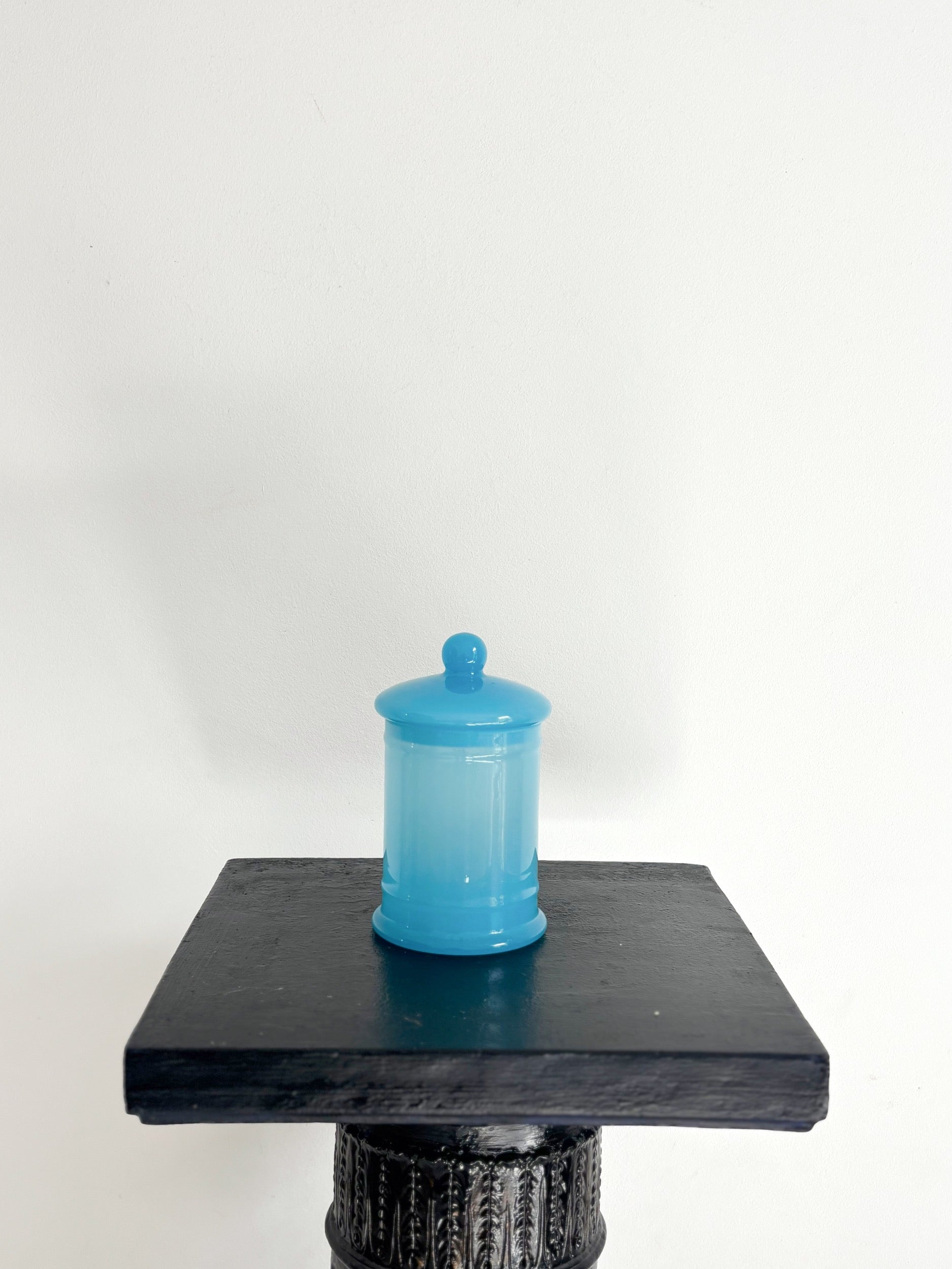 Bonbonnière ou boite pour coton, bleue en opaline translucide. Forme droite, probablement issue d'un nécéssaire de toilette pour coiffeuse. Vintage et en excellente condition.