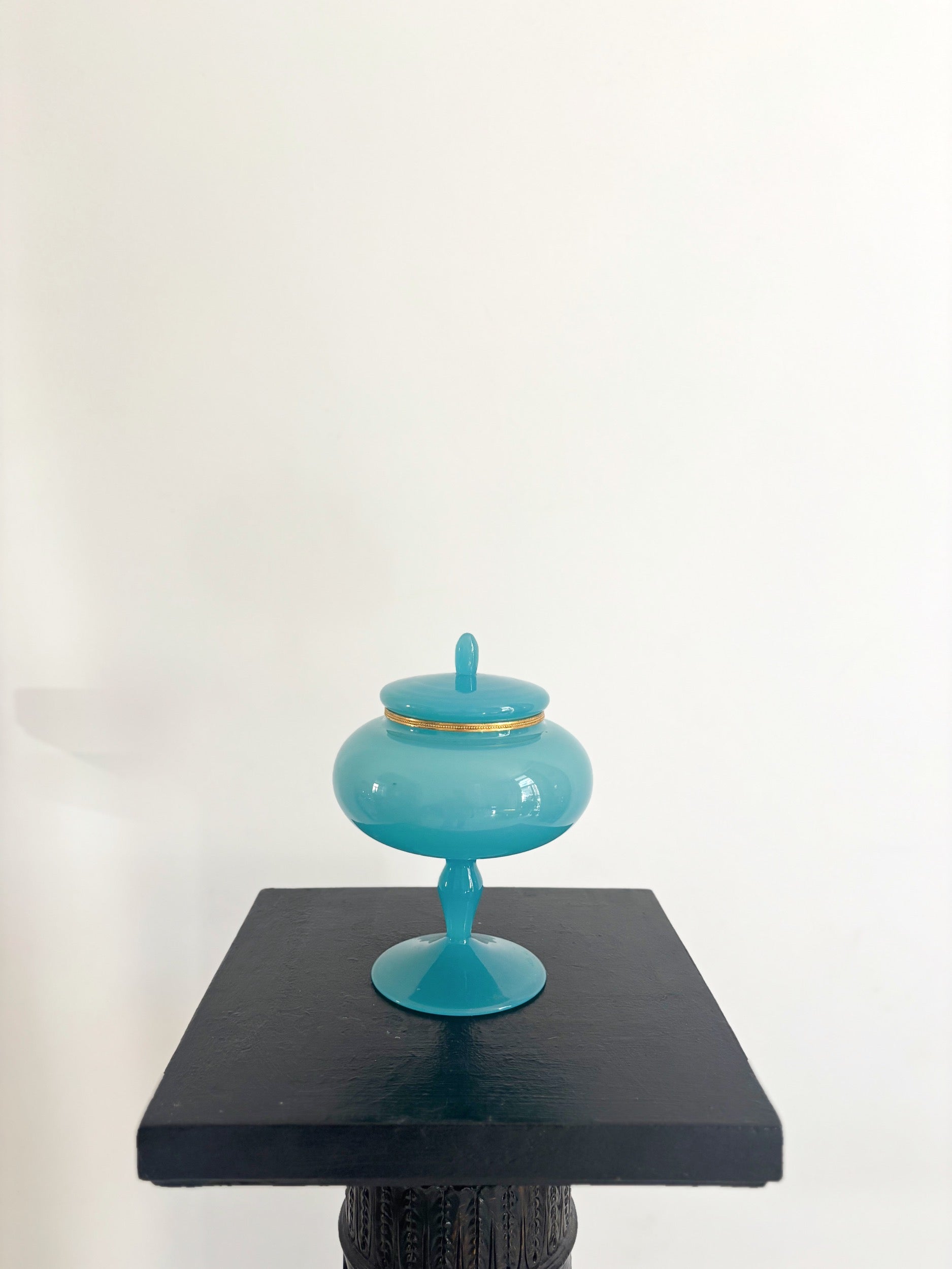 Bonbonnière en opaline bleue, drageoir plus précisément, bordée de laiton. Quelques traces de morsures sur le laiton mais très bel état général.