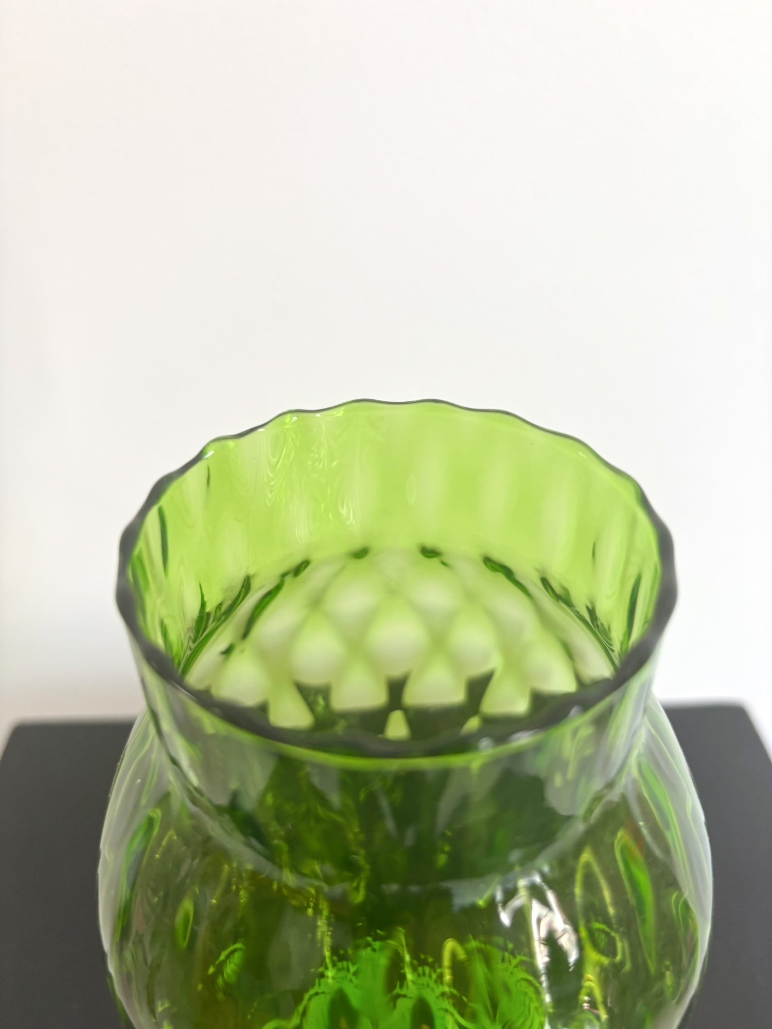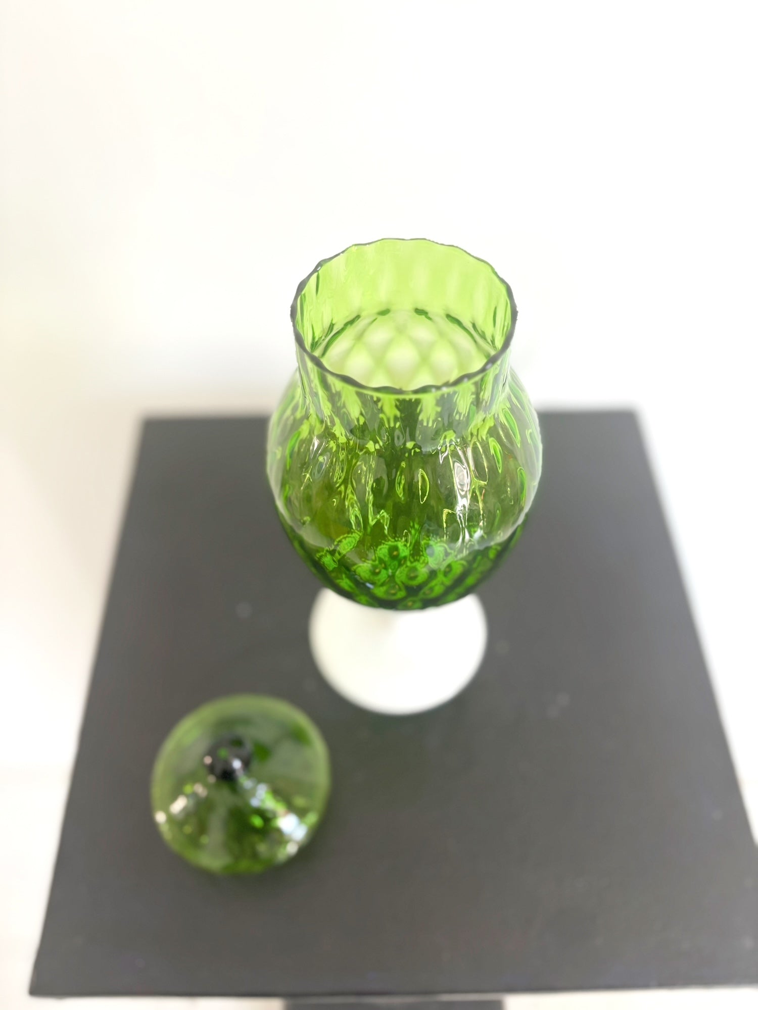 Bonbonnière en verre Empoli verte pied en opaline blanche
