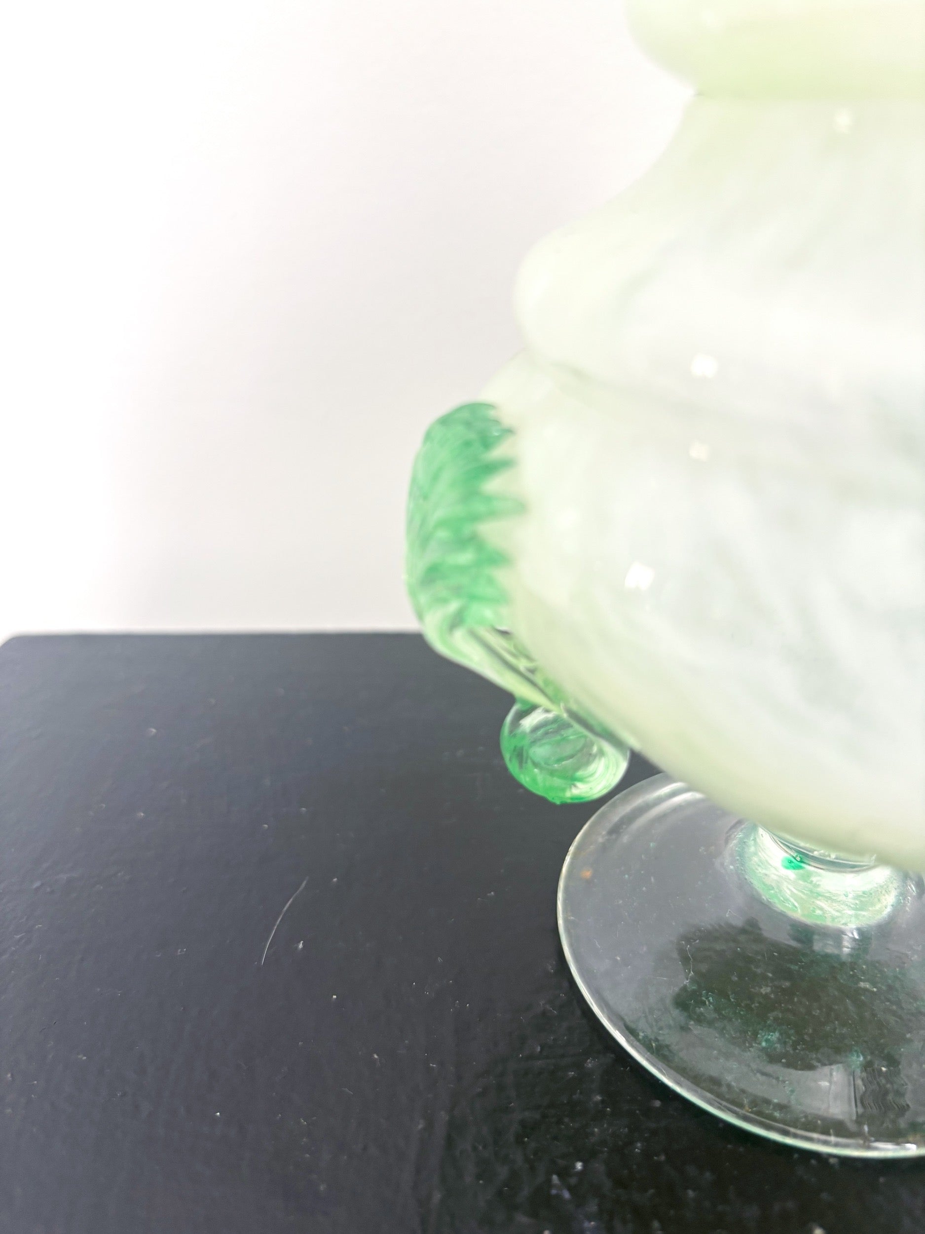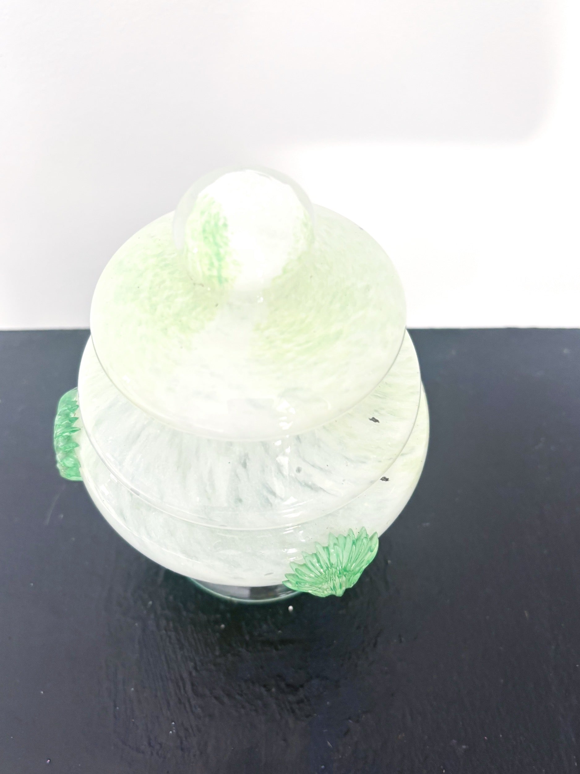 Petite bonbonnière verte en opaline et verre de Murano. Avec son étiquette. Vintage et en excellente condition.