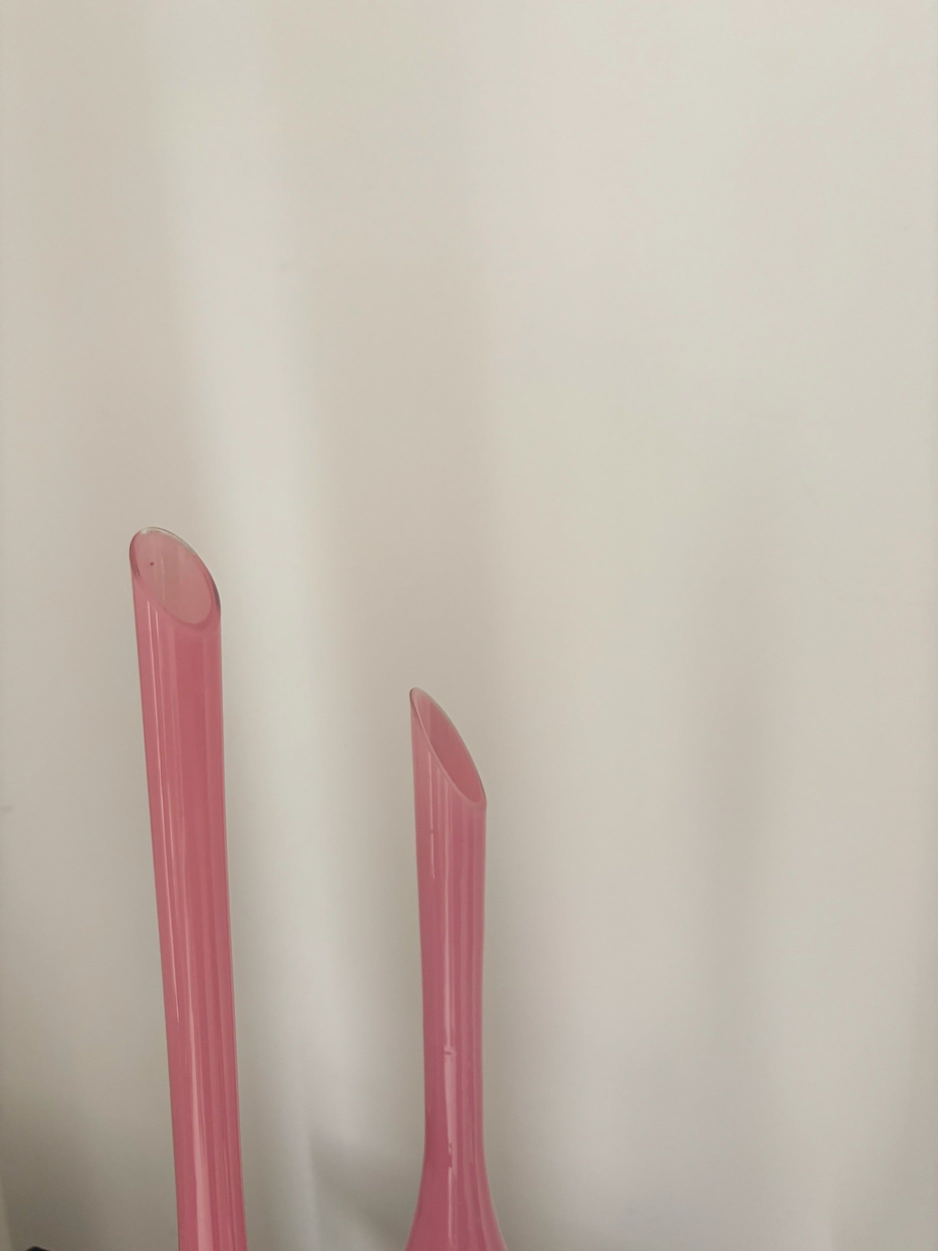 Ensemble de 2 soliflores, en opaline Florentine, roses; L'un a le pied en opaline opaque blanche et l'autre, en opaline irisée blanche. Vintage et en excellente condition.