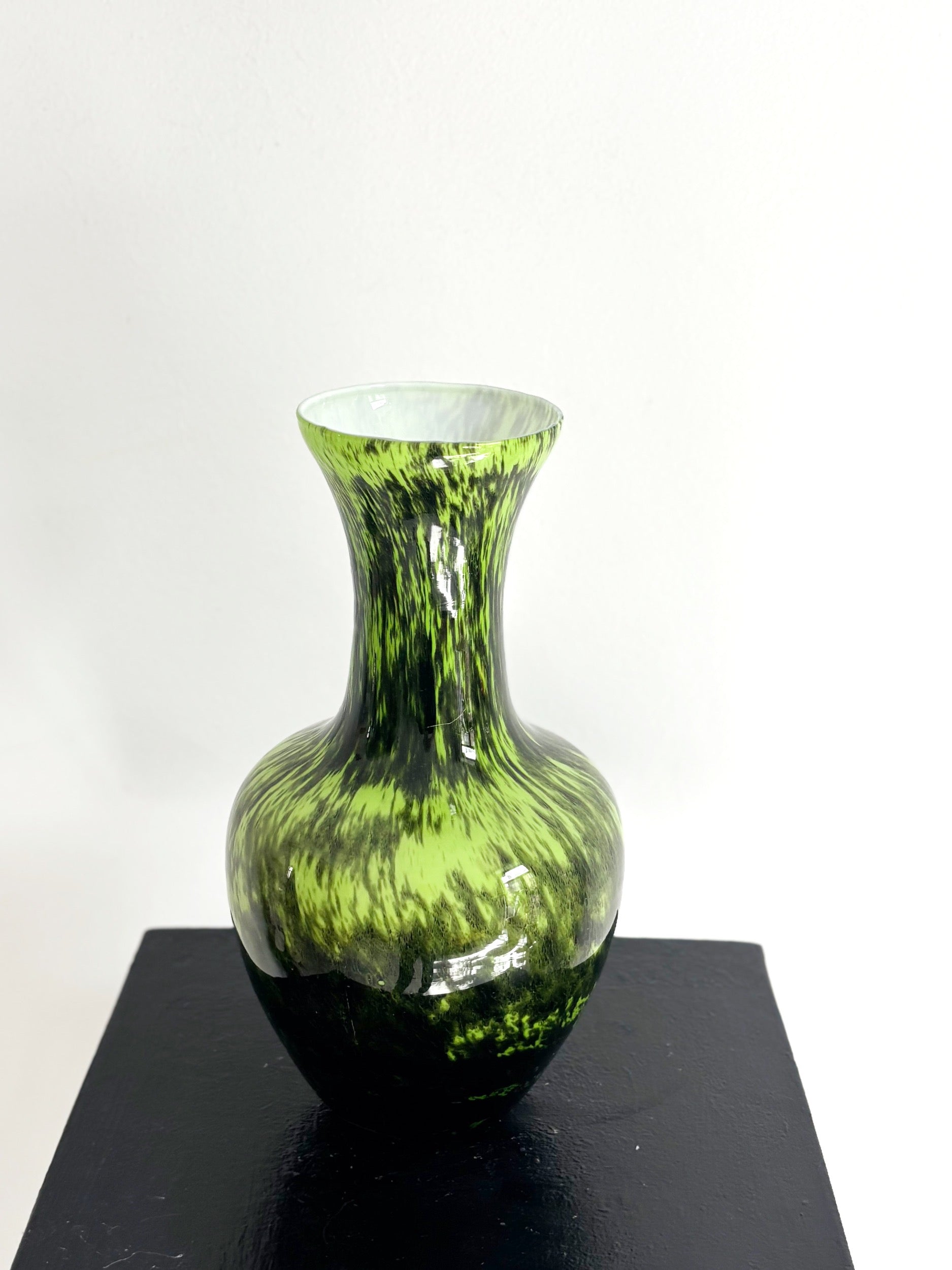 Vase en opaline d'Empoli, vert citron moucheté de noir, intérieur blanc. Vintage et en excellent condition.