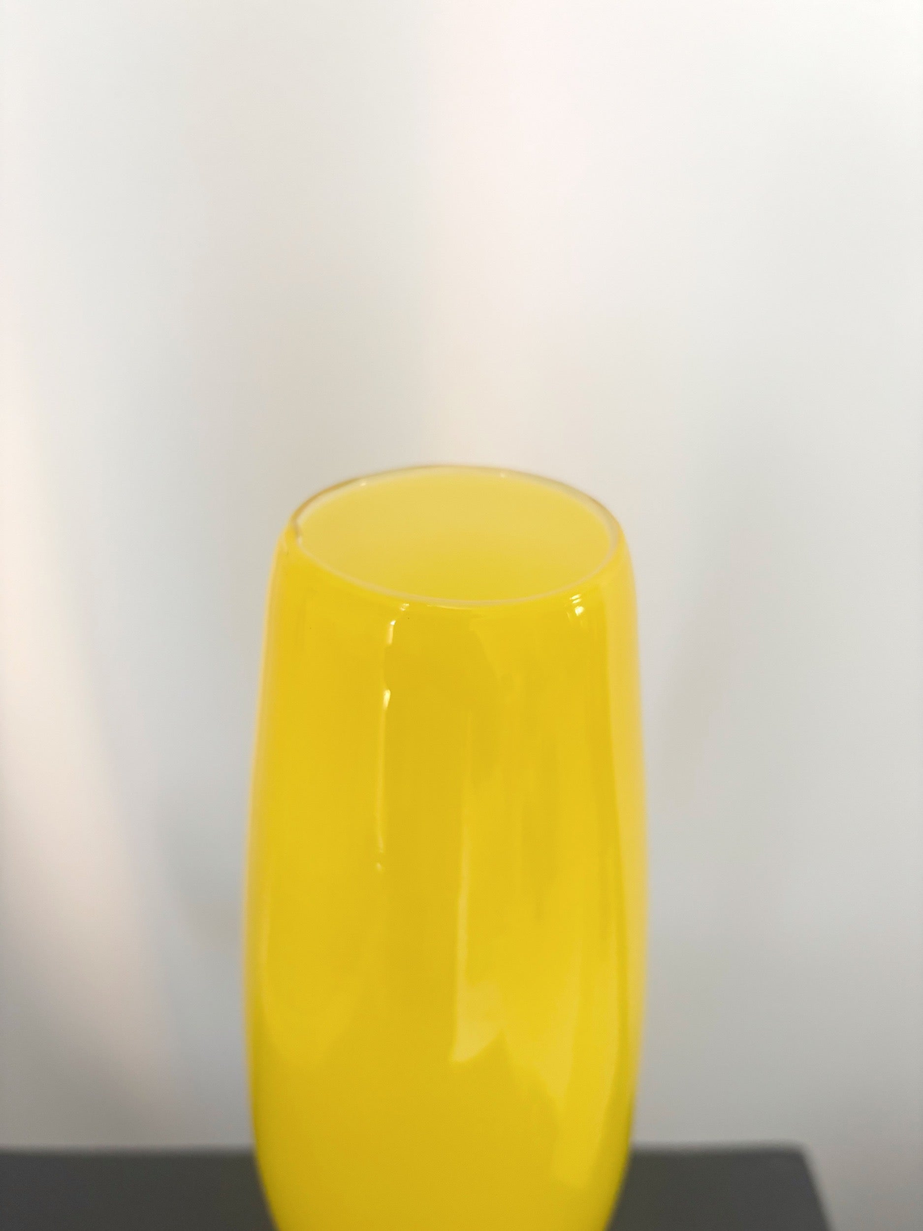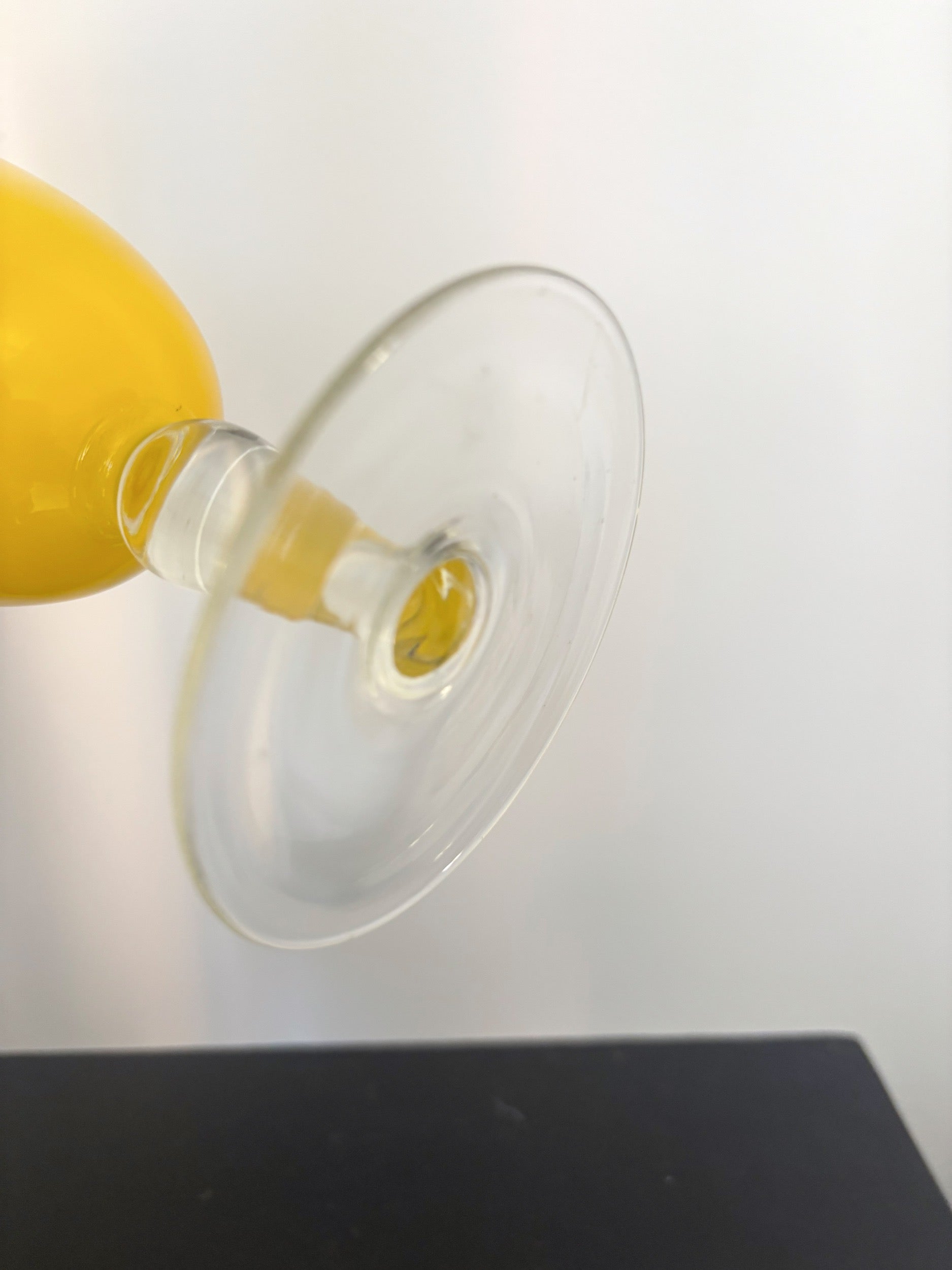 Vase en opaline jaune, pied transparent. Vintage et en excellente condition.